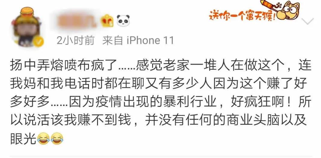 一個(gè)揚(yáng)中的網(wǎng)友在微博上說:揚(yáng)中弄熔噴布瘋了.....感覺老家一堆人在做這個(gè),連我媽和我電話時(shí)都在聊又有多少人因?yàn)檫@個(gè)賺了好多好多......