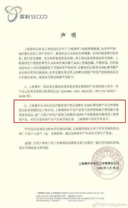 對于S2040聚丙稀能否應(yīng)用到熔噴布生產(chǎn),上海賽科也出了一份聲明,聲明上寫到:上海賽科從未向任何市場和用戶明示或默認(rèn)S2040聚丙稀產(chǎn)品可以用于無紡布領(lǐng)域的加工和應(yīng)用。上海賽科對于該產(chǎn)品用于這些特殊或個(gè)別用途不提供任何保證。